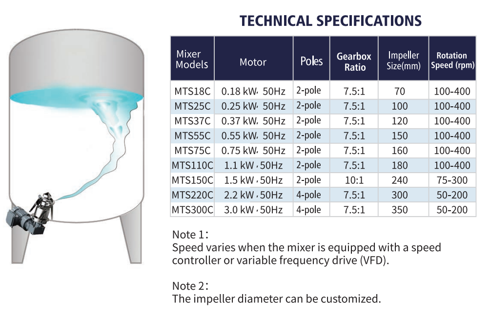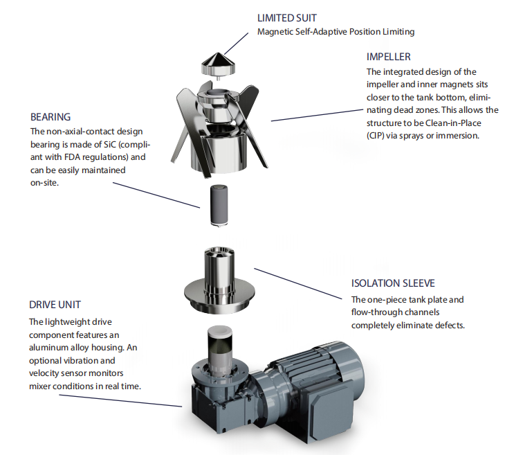 MTS re-optimized sterile design structure provides more stable rotation and longer bearing life. Suitable for applications requiring high cleanliness and long service life without any leakage, such as pharmaceuticals, chemicals, biochemicals, pesticides, etc.