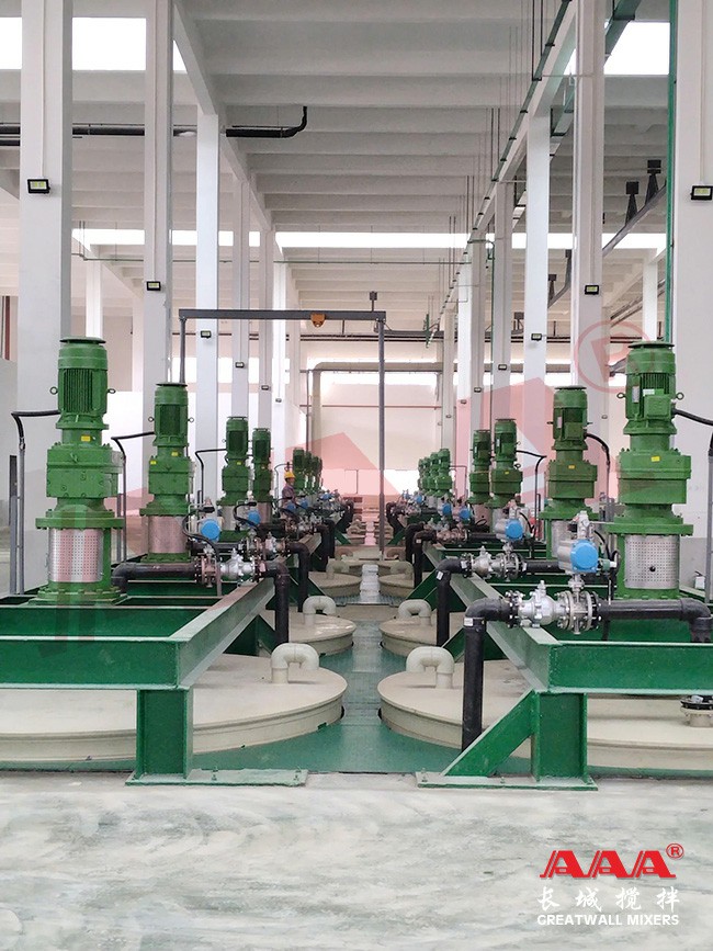 Hydrometallurgical extraction involves using leaching agents to dissolve valuable metal components or components to be extracted from ores, concentrates, calcines, and other materials into a solution or precipitate them as new solid phases. The mixing equipment typically needs to be corrosion-resistant and abrasion-resistant. In some leaching processes, oxygen must also be introduced. We have developed mixing equipment suitable for heat transfer, mass transfer, and reactions in gas-liquid-solid three-phase systems for the leaching process.
