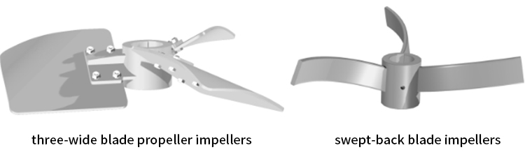 The three-wide blade propeller impellers consists of three helical conical wide blades, which possess significant turbulent expansion capability. The swept-back blade impellers achieves a substantial vertical circulation flow field. When used together, these two impellerss ensure uniform fluid distribution within the mixing tank.