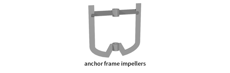 The anchor frame impellers has blades that resemble an anchor, covering the bottom and sidewalls of the mixing tank. It operates at low speed with high torque, making it suitable for mixing high-viscosity and high-density materials, such as paints, resins, and polymers. Its wall-scraping design prevents material from adhering to the container walls, enhancing mixing efficiency and improving heat transfer efficiency, making it ideal for processes requiring heating or cooling.